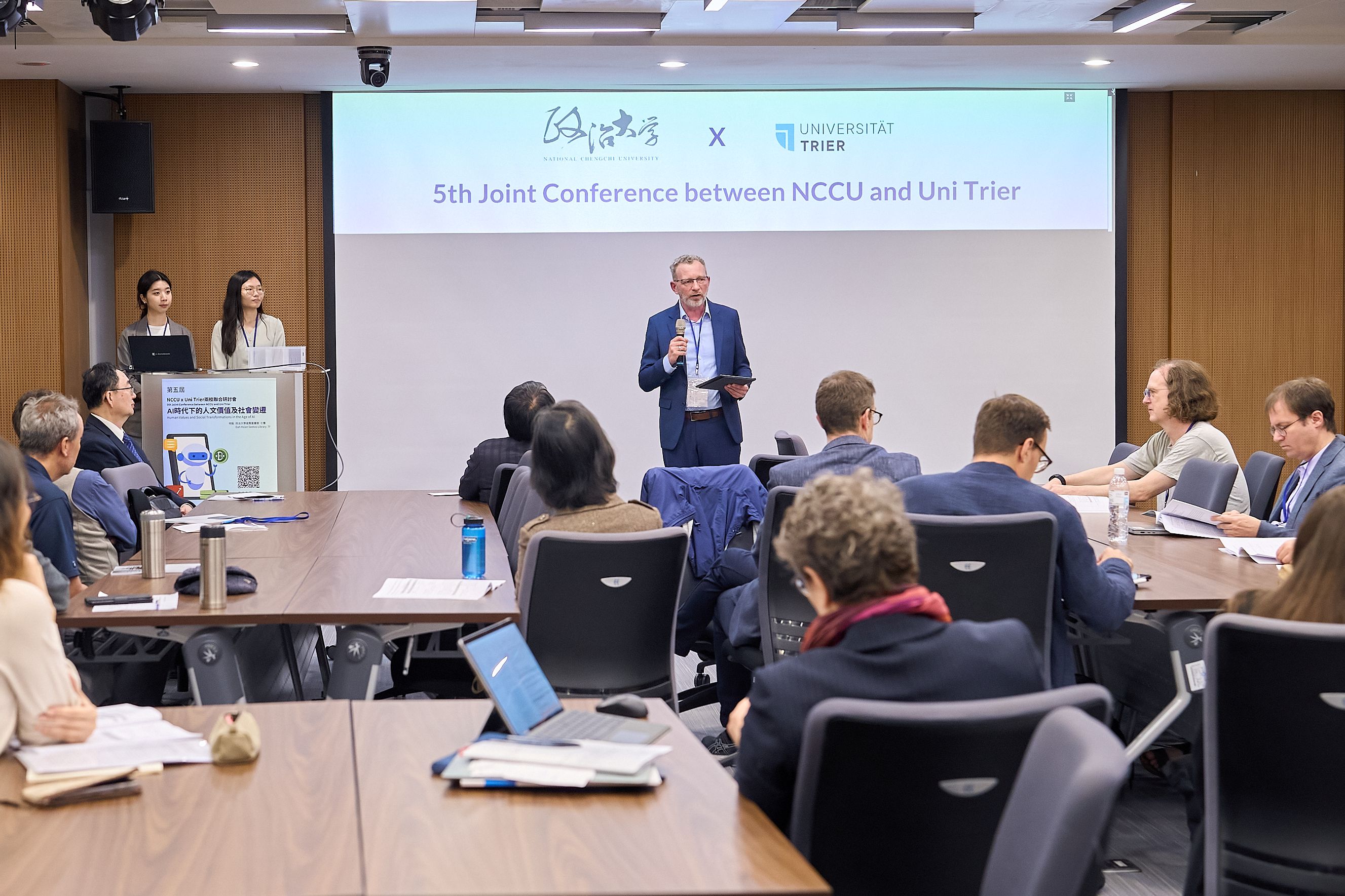 第五屆國立政治大學與德國特里爾大學聯合國際研討會於3月28至29日在政大達賢圖書館舉行,以「AI時代下的人文價值及社會變遷」為主題。研討會吸引特里爾大學18位教授來台,本校則有19位跨院系學者參與,並獲駐德代表處與德國在台協會關注,展現長期合作的成果。 本屆研討會開幕邀請多位貴賓致詞,以德、英、中三語進行,政大教務長林啟屏致詞歡迎來賓,期望深化台德學術連結與跨國研究。特里爾大學多位教授亦感謝政大的熱情接待,並回顧兩校自2016年起每兩年輪流舉辦會議的歷程,肯定雙方在語言、文化與社會研究上的持續合作。 本屆研討會涵蓋語言學、媒體、科技、歷史及政治等議題,探討AI對語言多樣性、媒體敘事及數位法律環境的影響。特里爾大學校長Eva Martha Eckkrammer於專題演講中指出,AI雖促進溝通便利,卻可能加劇語言不平等,呼籲制定策略以維護語言多樣性,而此次會議也為台德學術交流再添重要里程碑。
